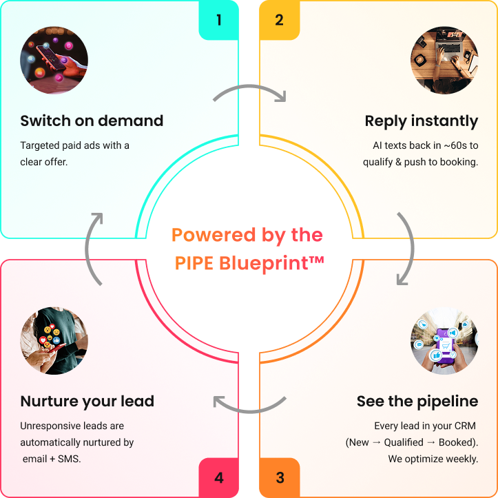Referrals and random posts are not a strategy. Paid ads create controllable demand. Our AI replies in ~60s and your CRM tracks every step.